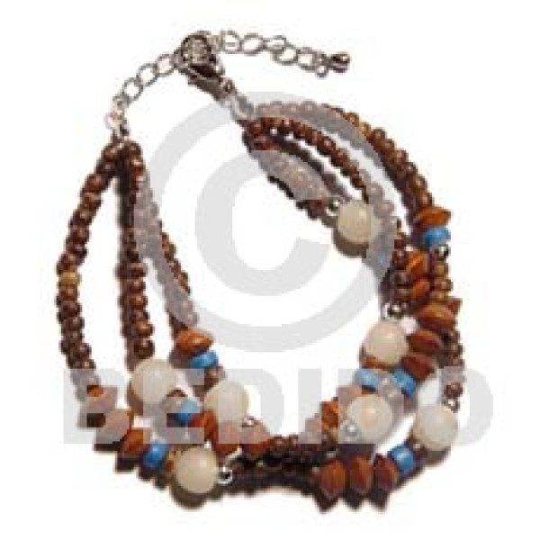 twisted 4 rows aquamarine 2-3mm coco heishe. 2 rows wood beads/3 rows cut green glass beads combinat..