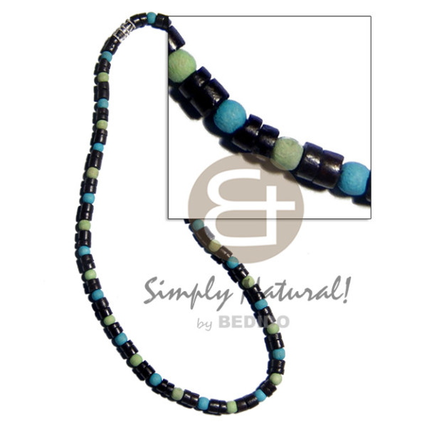 7-8mm black coco heishe dyed round nat. wood beads in aqua blue and mint green combination..