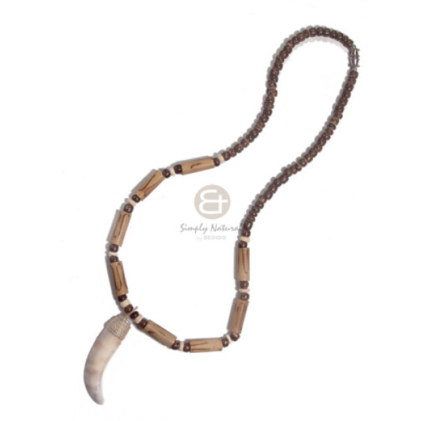 4-5mm coco Pokalet nat brown bamboo tube burning accent and cowrie fang shell pendant / 18in..
