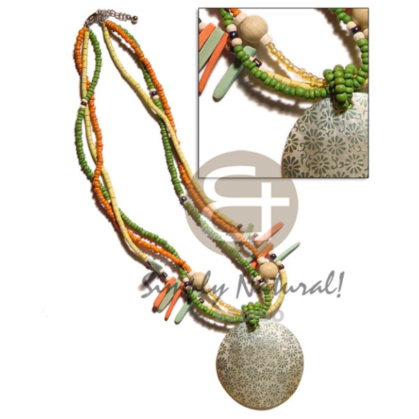 3 rows 2-3mm coco Pokalet. yelloorange /green coco sticks,wood beads & 40mm handpainted hammershell..