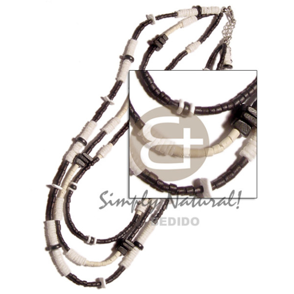 3 rows 2-3mm coco heishe black/bleach white clam & black coco sq. cut combination..