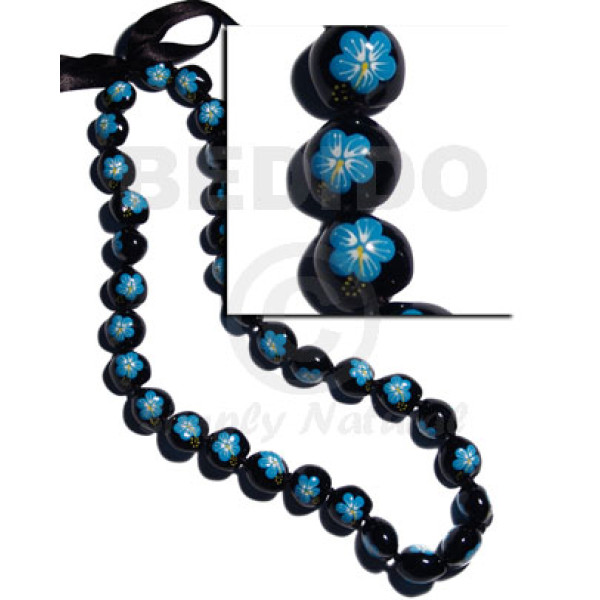 lei / black kukui seeds handpainted light blue flowers - 32 pcs/ 34 in.adjustable..