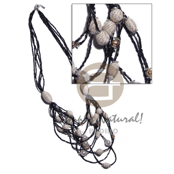 5 rows graduated multilayered black cut glass beads wrapped and buffed oval bleached wood beads/p..