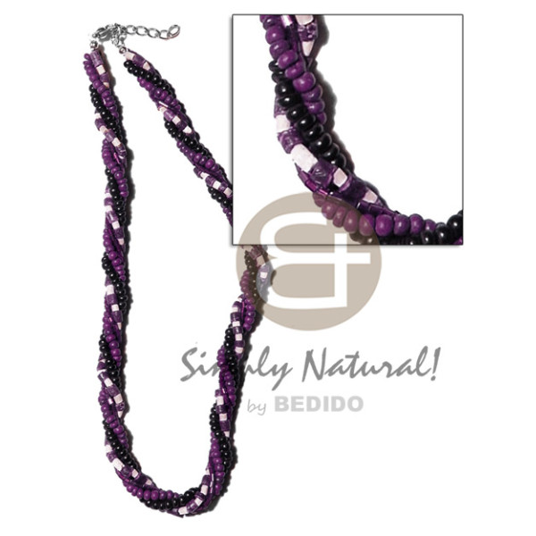 twisted 4 rows-2-3mm coco heishe violet/bleach whiten/2-3mm coco Pokalet. violet/black & glass beads..