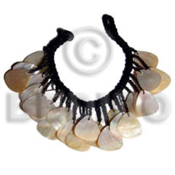dangling MOP/black tab/black lip leaf & acrylic crystals on on metal chain and wax cord..