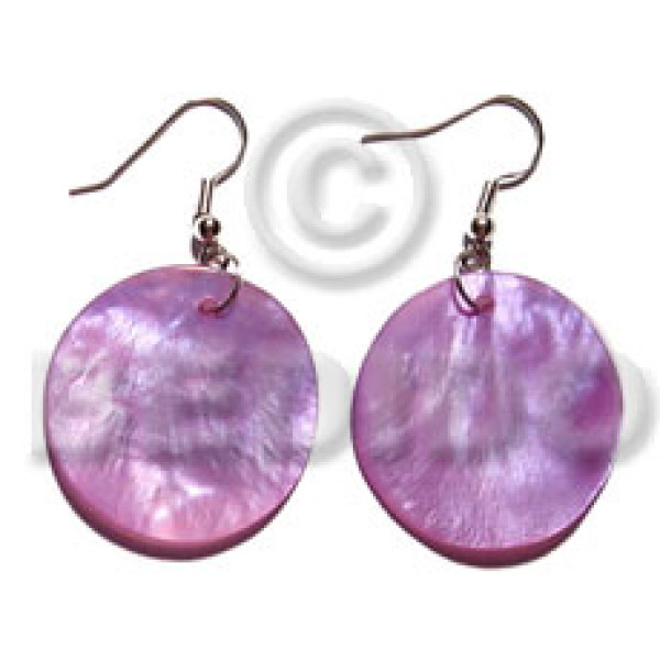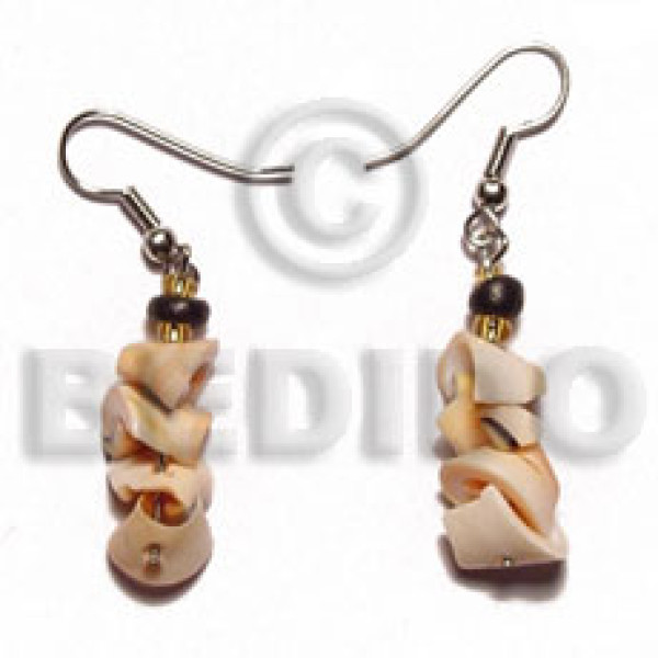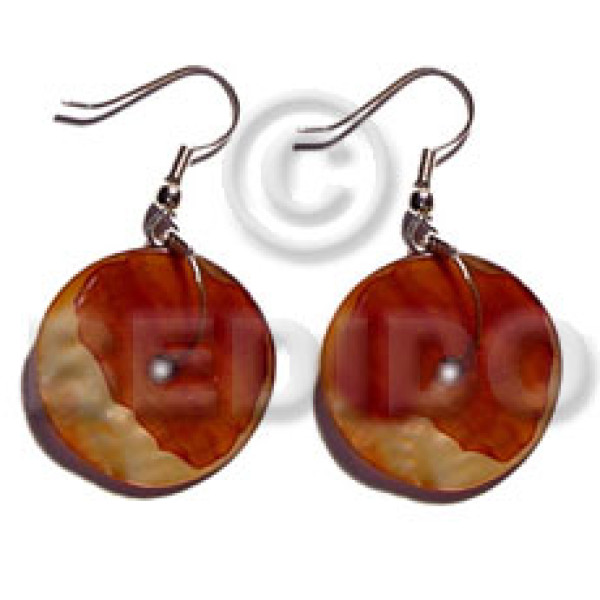 dangling round laminated brownlip brasswire trimming and black resin backing..