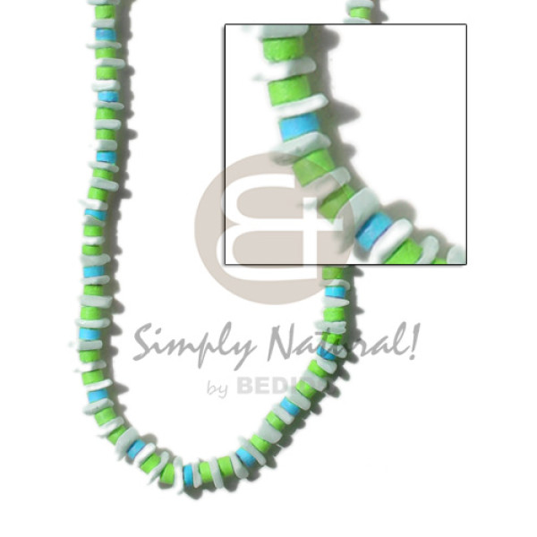 sq. cut white rose 4-5 mm aqua blue/bright green coco heishe alternate..
