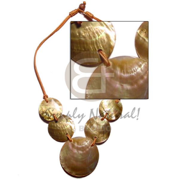 4 r0ws dark brown wax cord 16 pcs. 40mmx25mm laminated eyelet capiz in dark amber tones / 34in..