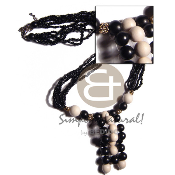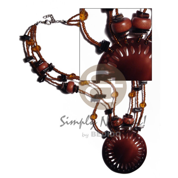 3 layers glass beads wood beads and sq. cut 55mm blacktab shell accent and round blacktab pendant..