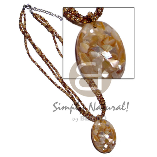 3 layers glass beads 50mmx35mm oval MOP chips in laminated resin pendant..