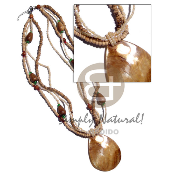 55mm brownlip heart pendant on 3 rows glass/cut beads combination / 18in..