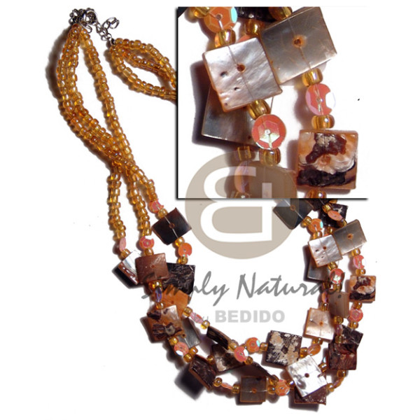 2-3mm coco heishe bleach blue/yellow sq cut hammershell & oval MOP pendant..