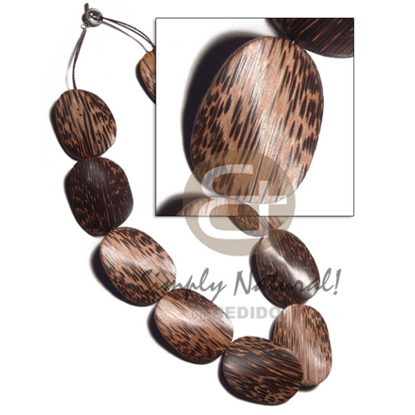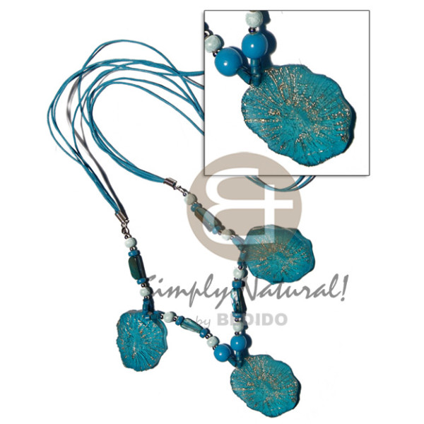 2 rows wax cord asstd wood beads, 35mmx25mm oval crocheted wood beads and 3 pcs. 30mm hammershell a..