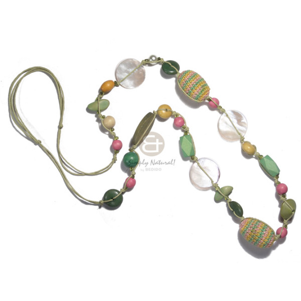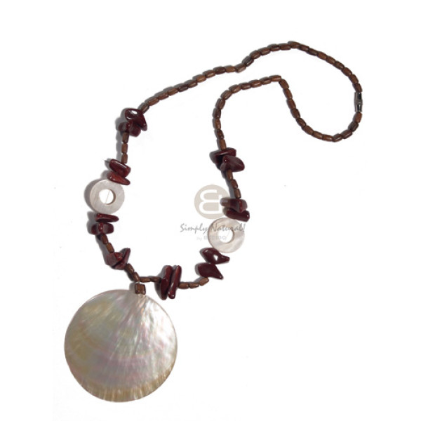 65mm round MOP wood ricebeads, shell rings, acrylic nuggets combination neckline / 20in..