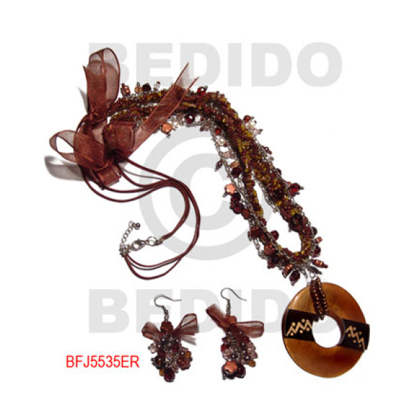 tribal wooden shield carved 44mmx25mm pendant wood beads/metal accent in double wax cord / 23in...